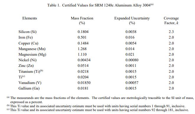 SRM 1240c 中選定元素的認證值列于表 1。用戶應注意,鈦 (Ti) 有兩個認證值。 SRM 1240c 的每個單元都帶有一個序列號。 Ti 的正確值是與設備序列號相關的值。表 2 列出了選定元素的參考值。信息值列于表 3。對于所有元素,值均以質量分數形式報告 [1]。賦值類別基于 NIST 對化學參考物質 [2] 使用的術語和模式的定義,不確定性根據 ISO/JCGM 指南 [3] 進行評估。