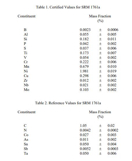 SRM 1761a 的值分配基于此 SRM 與原始 SRM 1761 的完整、高精度比較。SRM 1761a 的材料被證明與所有元素的原始材料沒有區(qū)別,除了 C、N 和 V . SRM 1761a 的賦值被認(rèn)為可以直接追溯到用于 SRM 1761 賦值的主要參考物質(zhì)和校準(zhǔn)。C 和 N 的賦值是使用基于 SRM 1761 的校準(zhǔn)通過燃燒和紅外檢測獲得的。V 的賦值是通過 X 射線熒光光譜法獲得的基于低合金鋼 SRM 1761 至 1768 的校準(zhǔn)。在此證書中列出了賦值中采用的測試方法。