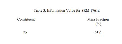 表 1 報告了 SRM 1761a 的 14 種成分的認(rèn)證值。表 2 報告了七種成分的參考值。表 3 報告了 Fe 的信息值。對于所有元素,值都以質(zhì)量分?jǐn)?shù)報告 [1]。賦值類別基于 NIST 用于化學(xué)參考材料 [2] 的術(shù)語和模式的定義。