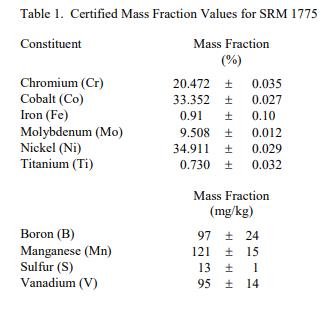 NIST SRM 1775耐火合金MP-35-N(標準品)為圓盤形式,直徑約 35 毫米(1.375 英寸),厚 12.7 毫米(0.5 英寸),用于光發射和 X 射線光譜分析方法。認證的質量分數值:認證的質量分數值在表 1 [1] 中提供。 NIST 認證值是 NIST 對其準確性有最高置信度的值,因為所有已知或可疑的偏差來源都已被調查或考慮在內 [2]。認證值是根據 NIST 和合作實驗室進行的分析結果對真實值的當前最佳估計。