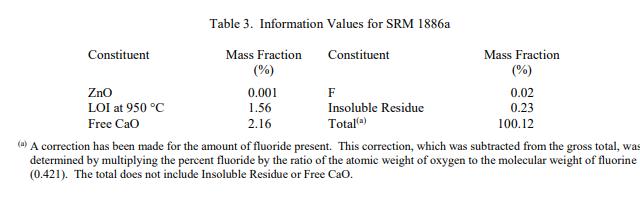 表 3 中提供了 ZnO、F、不溶性殘留物、燒失量 (LOI)、游離 CaO 和所有成分總和的信息值。這些是未經(jīng)認(rèn)證的值,沒有評(píng)估不確定性。
