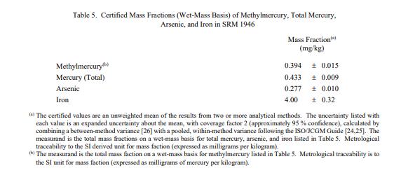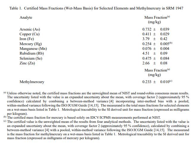 NIST SRM 1947密西根湖魚類組織(標準品)表 5 中提供了其他 PCB 同系物、氯化農藥、PBDE 同系物和全氟辛烷磺酸 (PFOS) 的參考質量分數值。表 6 和表 7 中提供了近似值、熱量含量、選定脂肪酸的參考值。表 8 顯示了 SRM 1947 中 Hg 同位素比差異的參考值。參考值是代表基于真實值的最佳估計的非認證值關于可用數據;但是,這些值不符合 NIST 的認證標準 [1],并且提供了相關的不確定性,這些不確定性可能僅反映測量再現性,可能不包括所有不確定性來源,或者可能反映多種分析方法之間缺乏足夠的統計一致性。