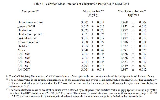 表 1 給出了 15 種農藥中 13 種農藥的認證質量分數和估計不確定度。這些值基于該溶液的重量法制備中使用的數量以及使用氣相色譜法獲得的分析結果(GC) 并以質量分數單位報告 [1]。 NIST 認證值是 NIST 對其準確性具有最高置信度的值,因為所有已知或可疑的偏差來源都已被調查或考慮在內 [2]。被測量是表 1 中列出的農藥,認證值在計量上可追溯至以微克/千克表示的質量分數的 SI 派生單位。