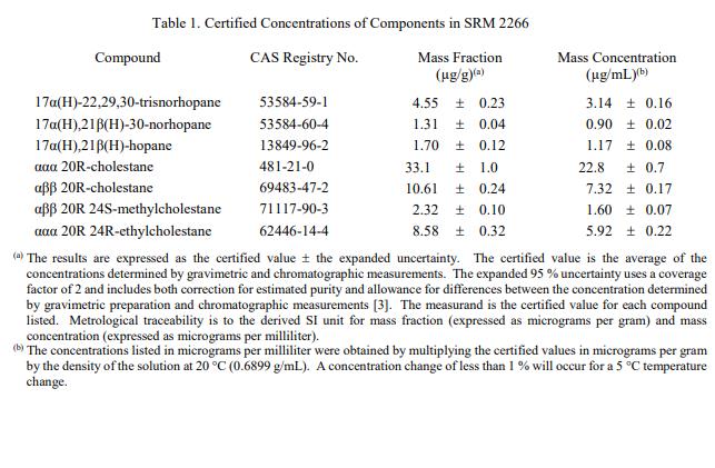 NIST SRM 2266 2,2,4三甲基戊烷中藿烷 甾烷(標準品)的認證在規定的測量不確定度內有效期至 2026 年 3 月 31 日,前提是按照本證書中給出的說明處理和儲存 SRM(參見“處理、儲存和使用說明”) ”)。如果 SRM 損壞、污染或以其他方式修改,則認證無效。