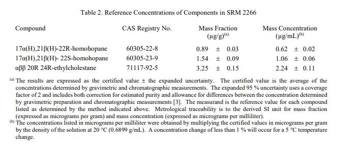 表 2 中提供了兩種額外藿烷和一種額外甾烷的參考值,也表示為質量分數。參考值是不符合 NIST 認證標準的非認證值,并提供了相關的不確定性,可能反映僅測量精度,可能不包括所有不確定性來源,或者可能反映多種方法之間缺乏足夠的統計一致性。