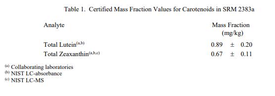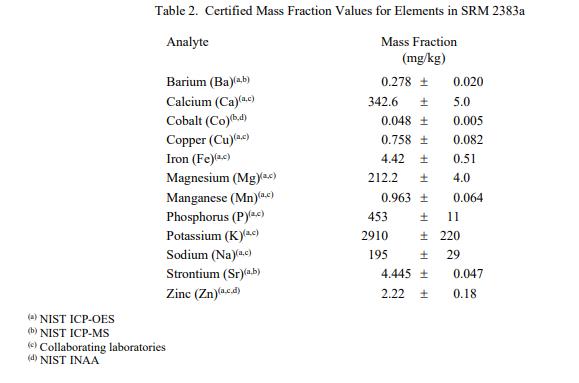 表 1 和表 2 中提供了 SRM 2383a 中類胡蘿卜素和元素的認(rèn)證質(zhì)量分?jǐn)?shù)值,按原樣報(bào)告。NIST 認(rèn)證值是 NIST 對(duì)其準(zhǔn)確性有最高置信度的值因?yàn)樗幸阎蚩梢傻钠妬碓炊家驯徽{(diào)查或考慮到[1]。價(jià)值分配分析由 NIST 和合作實(shí)驗(yàn)室進(jìn)行。