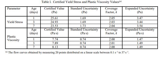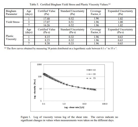 NIST 認(rèn)證值是 NIST 對(duì)其準(zhǔn)確性有最高置信度的值,并且所有已知或可疑的偏差來源都已調(diào)查或考慮在內(nèi) [1]。經(jīng)認(rèn)證的 Bingham 屈服應(yīng)力和塑性粘度值在表 1 中給出,并且是基于在 NIST 由單個(gè)操作員使用平行鋸齒板流變儀進(jìn)行的分析測量結(jié)果。粘度與剪切的完整曲線