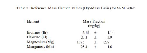 表 2 中提供了溴、氯、鎂和錳的參考值,以基于干質(zhì)量的質(zhì)量分?jǐn)?shù) [1] 表示。參考值是最佳估計(jì)值的非認(rèn)證值的真實(shí)價(jià)值;但是,該值不符合 NIST 的認(rèn)證標(biāo)準(zhǔn),并且提供了相關(guān)的不確定性,該不確定性可能僅反映測(cè)量精度,可能不包括所有不確定性來(lái)源 [2]。